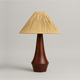 —a beautiful blend of earthy textures and thoughtful design. The robust mango wood base, hand-carved with smooth, flowing curves, provides a natural contrast to the intricate rafia shade that crowns the piece. The soft, woven texture of the rafia creates a calming ambiance, while the warm wood tone grounds the design, making it a perfect addition to any space.